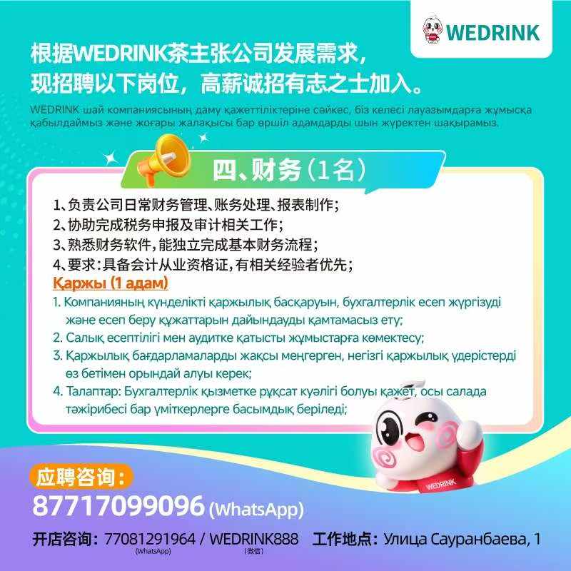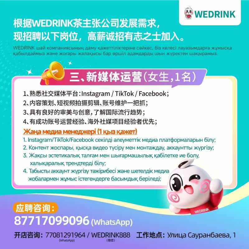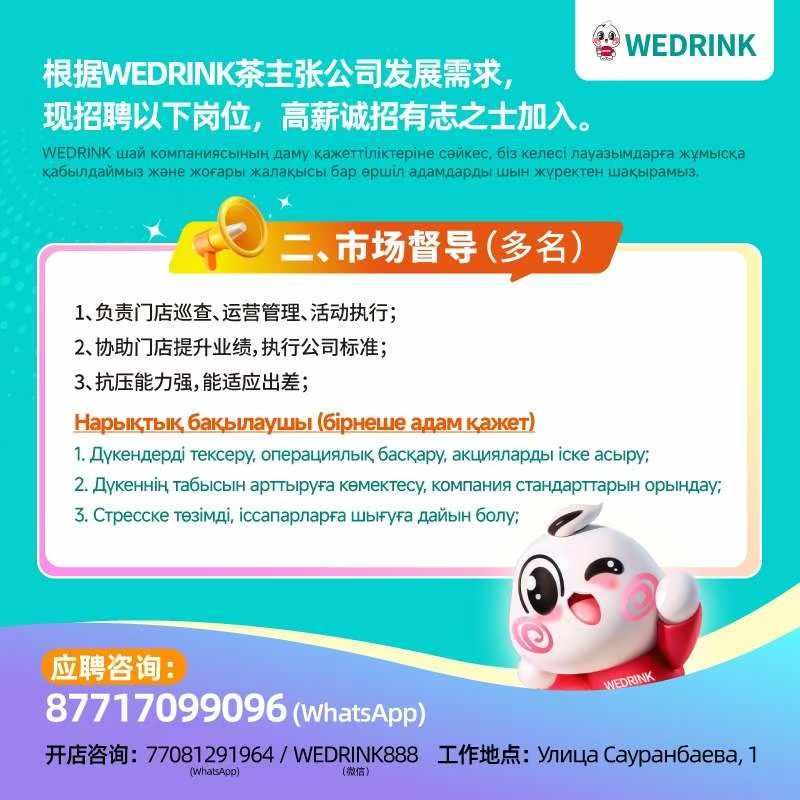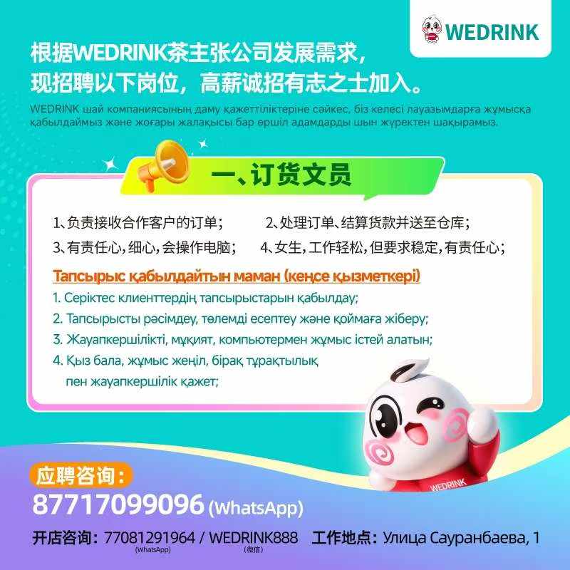 WEDRINK茶主张针对哈萨克斯坦市场首次开放商业合作机会(品牌授权),目前已有10多家店铺营业,其余店铺陆续装修中。根据公司发展需求,现招聘以下岗位,高薪诚招有志之士加入。