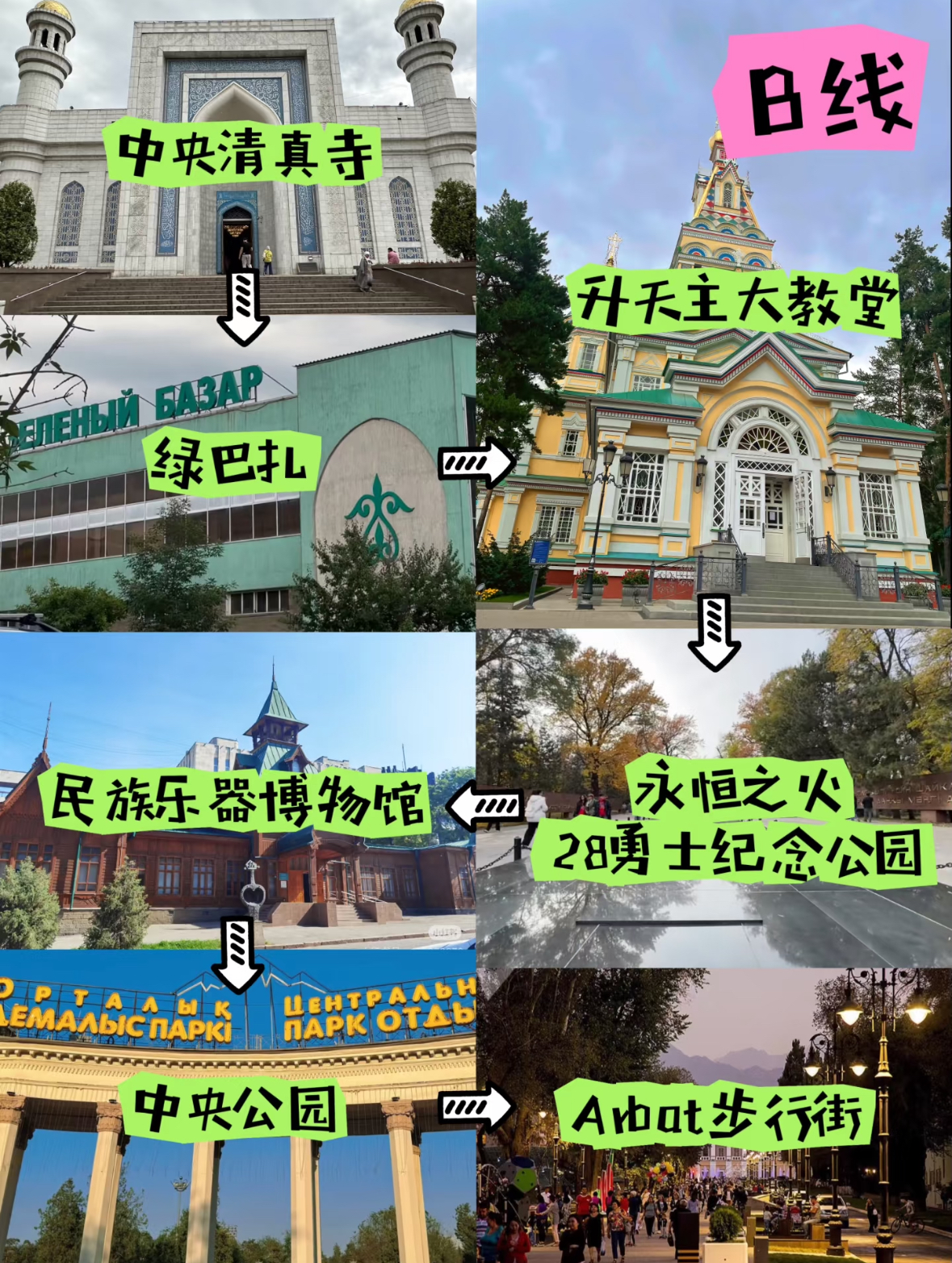 · ⛪️升天大教堂:位于潘菲洛夫公园内,是世界第二高的木制建筑,色彩艳丽,内部壁画精美,是阿拉木图的标志性建筑。教堂开放时间是8-18点,免费参观。可以拍照,但不能拍他人。门口有头巾可以领取佩戴。室外拍照推荐教堂南侧,几乎没有人。北侧广场可以喂鸽子。教堂东侧是乐器博物馆。